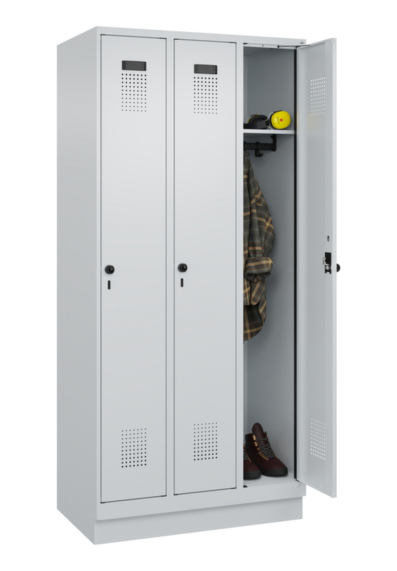 Je Abteil ein festverschweisster Hutboden und darunter eine Kleiderstange mit 3 verdrehsicheren Doppelschiebehaken